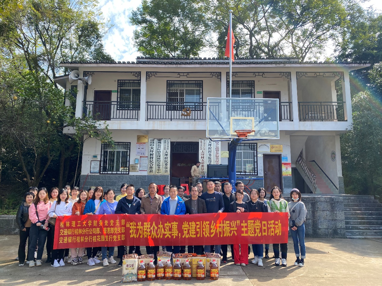为开展好形式多样的党建活动,增强党员党性教育,2021年11月13日财务处党支部与交通银行桂林分行公司部、普惠部党支部和交通银行桂林分行桂花园支行党支部前往阳朔县葡萄镇大岭头村开展联学共建主题党日活动,活动主题为“我为群众办实事,党建引领乡村振兴”。